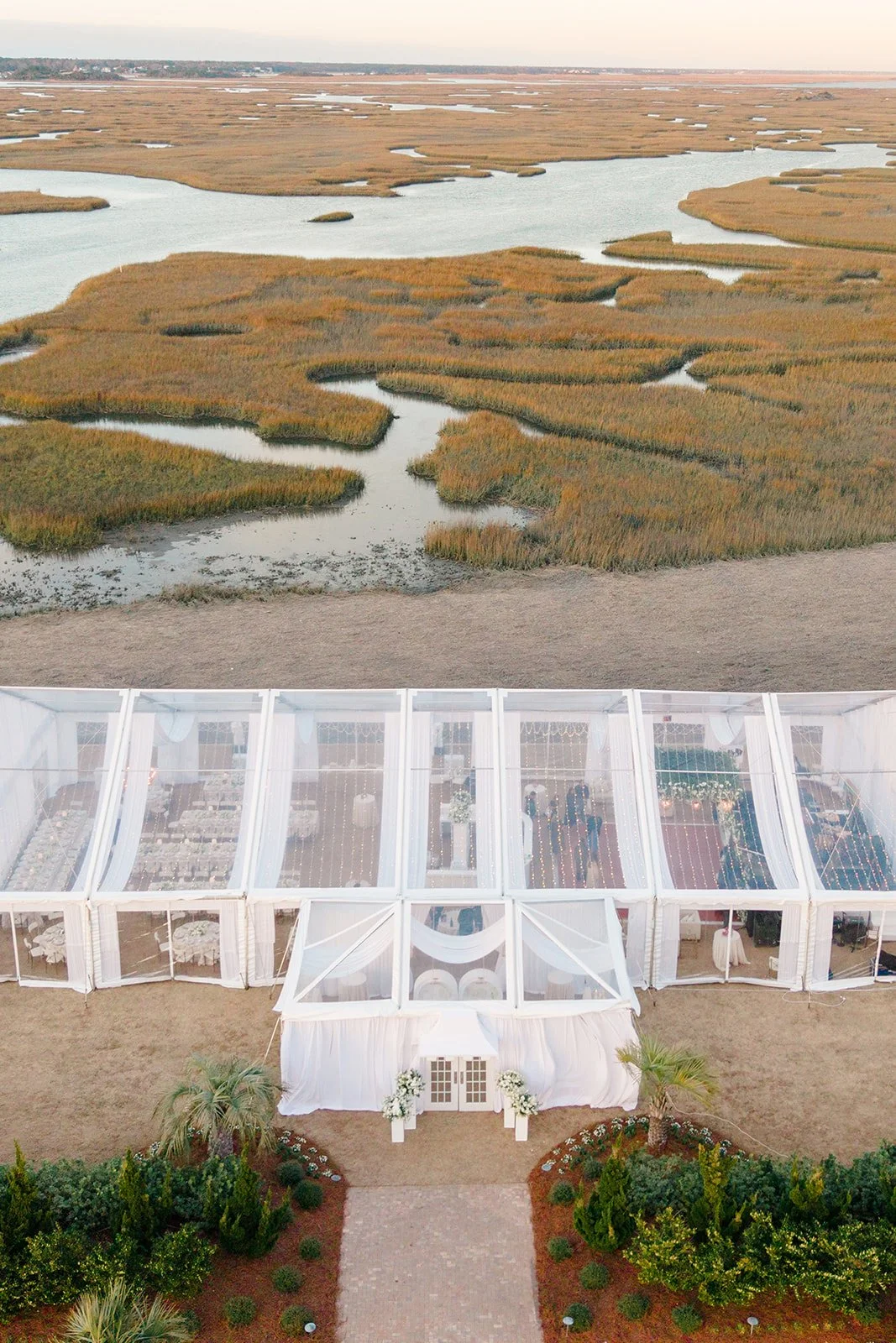 The goal for this event was simple: create an atmosphere that felt timeless, elegant, and immersive while still allowing the natural beauty of Figure Eight Island to shine through. Drapery was the star of the show, adding softness, movement, and architectural interest to both tents.